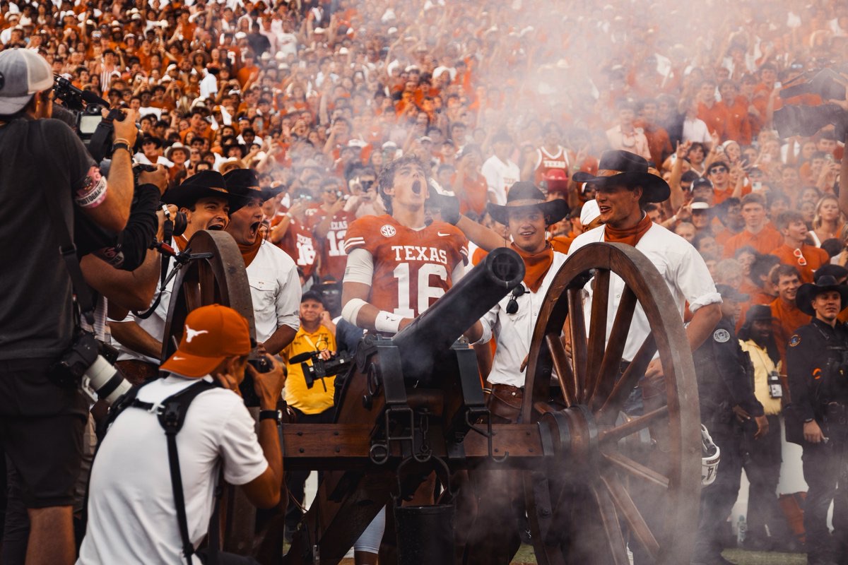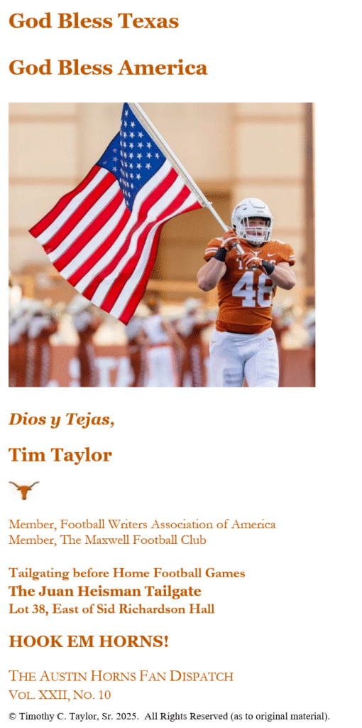 What a day at the Cotton Bowl! One of the best Texas-OU games I have attended, and I have seen some great ones. The Longhorn Fans were fantastic. It was impressive. After a bumpy first half, the Longhorns came out with fire and fury in the second half and slammed the door shut on Oklahoma as they slammed Mateer and other Land Thieves into the turf of the Cotton Bowl. Malik Muhammad with two interceptions, Arch Manning with an incredibly solid day, Quintrevion Wisner with 94 yards on 22 hard-nosed physical runs, good push by both the offensive and defensive lines. Texas with 3 interceptions and 5 sacks, Land Thieves with just one sack. The second year in a row where the Land Thieves didn’t get in the endzone. Full recap below. It was a great day to be a Texas Longhorn! It is always a great day to be a Texas Longhorn!