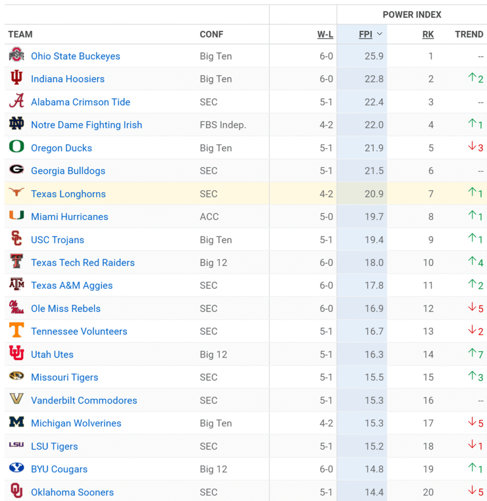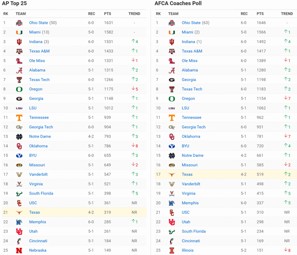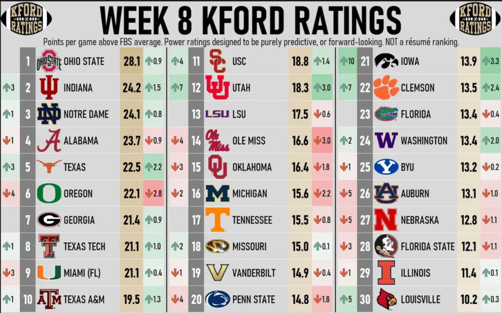 Ohio State, Indiana, Miami (FL), Texas Agricultural & Mechanical, San Aggies, Ole Miss, Alabama, Notre Dame, Georgia, and Louisiana State. Land Thieves drop to No. 18, and Texas jumps up to No. 23.