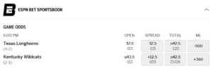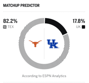 The Leland Sanford Junior University 10, Southern Methodist University 34. “Mustangs are favored by a whopping 17.5. Mustangs to win and cover.” ✔️
