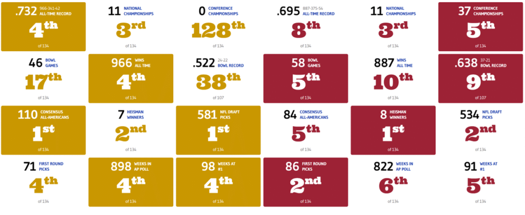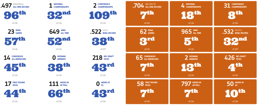 | Penalties | #120, #12 – 48, 414 yards | #25, #2 – 29, 225 yards |