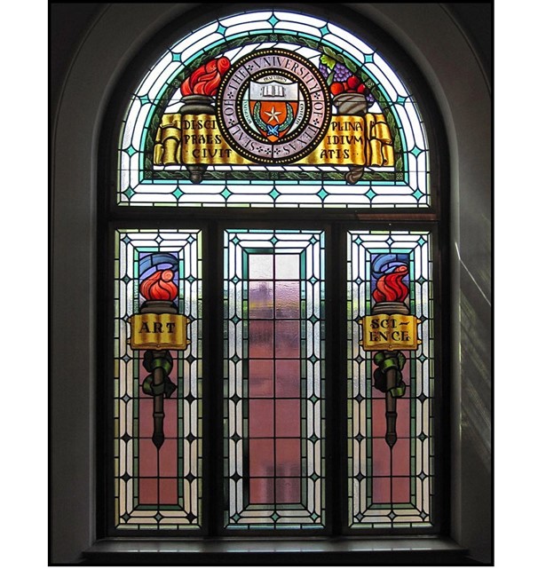 October 1908: U.T. Austin’s first student gift was a stained-glass window donated by the Ashbel Smith Literary Society, named for the first chair of the Board of Regents. Created by Harry Goodhue from Cambridge, MA, it’s now in the stairwell next to the UT President’s Office.
