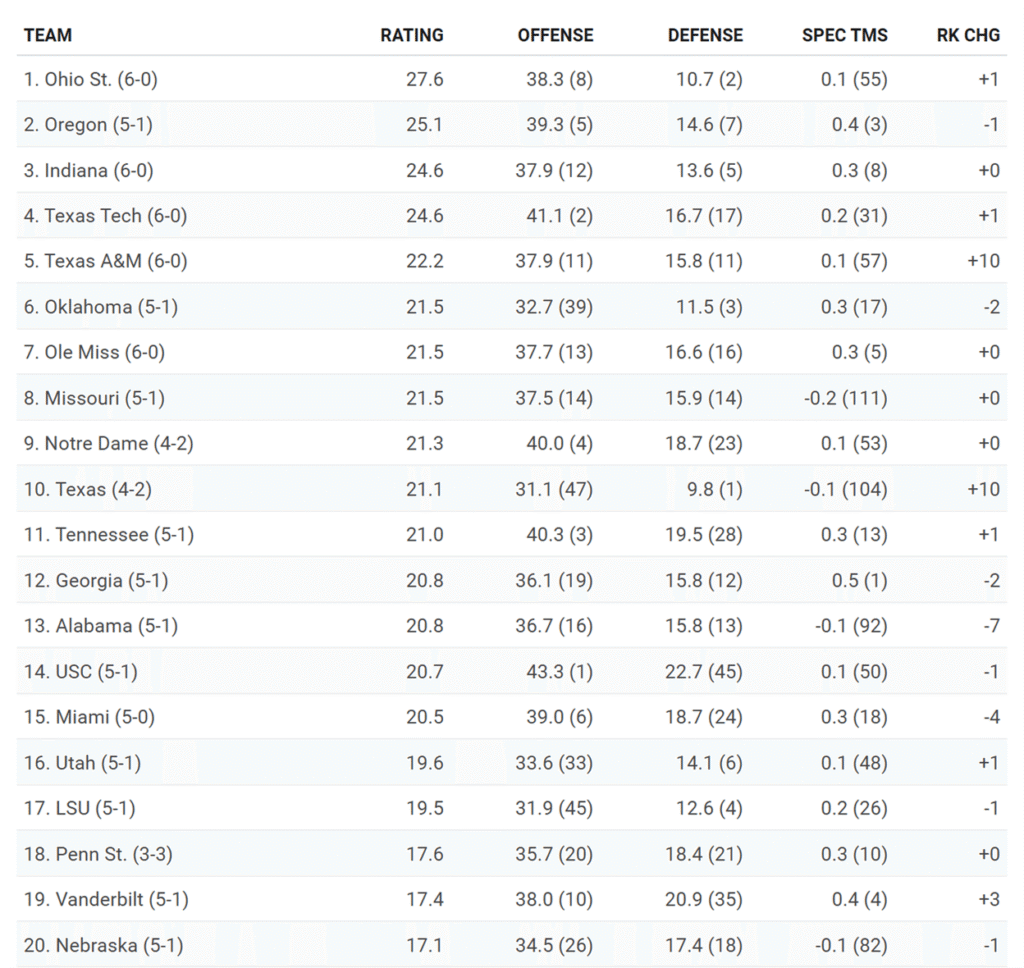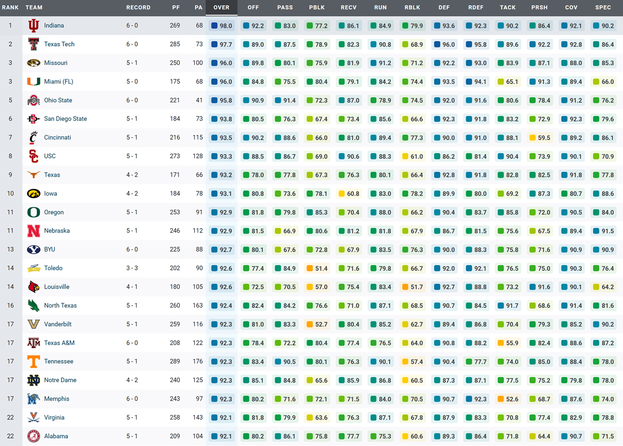 PFF The Ohio State University No. 1, followed by Miami (FL), Indiana, Texas Agricultural & Mechanical, Alabama, Sand Aggies, Ole Miss, Georgia, Oregon, and Louisiana State. Texas is back in at No. 20.