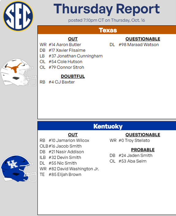 The Longhorns head to the Bluegrass State for another SEC road game. Kickoff is at 6:00 p.m. on ESPN from Kroger Field in Lexington. Dave Flemming will handle the play-by-play and Brock Osweiler the analysis. Stormy Buonantony is the sideline reporter. The game can be heard around the world on the Longhorn Radio Network with the Voice of the Longhorns Craig Way, joined by Roger Wallace in the booth and by Will Matthews on the sidelines. Listen in Austin on the Flagship, KVET 1300 AM and 98.1 FM, in Tyler on KTBB 600 AM and 92.1 FM, and in Midland on KBAT 99.9 FM. Listen in San Angelo and the Concho Valley with Mr. McLaughlin on KKSA 1260 AM. SiriusXM Channel 82. Dr. Rubén Pizarro-Silva and Jesus Mendoza with the call in Spanish on certain Longhorn Radio Network affiliates and streaming on the Texas Longhorn App and online.